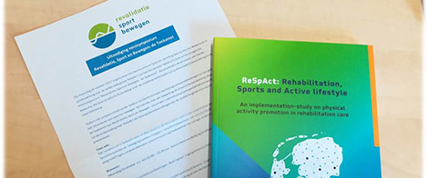 Daarnaast geeft Revalidatie, Sport en Bewegen een unieke kans voor het opzetten en uitvoeren van wetenschappelijk onderzoek. Hiervoor is de ReSpAct studie opgezet (www.respact.nl). ReSpAct staat voor Revalidatie, Sport en Actieve leefstijl en is een landelijk multicenter longitudinaal cohort onderzoek naar het programma Revalidatie, Sport en Bewegen. Binnen de ReSpAct studie zijn data verzameld op verschillende niveaus (professional en patiënt), met verschillende meetinstrumenten (online registratiesysteem, vragenlijsten, interviews) en op verschillende momenten in de tijd. Zo zijn ruim 70 professionals en ruim 1700 patiënten geïncludeerd in het onderzoek ReSpAct. Het beweeggedrag, gezondheid en zorggebruik van deelnemende patiënten is tot een jaar na ontslag gedetailleerd bevraagd en in kaart gebracht. Dit heeft geresulteerd in een unieke en rijke dataset waar vele vragen vanuit een onderzoeks-, praktijk- en beleidsperspectief mee beantwoord zijn2.